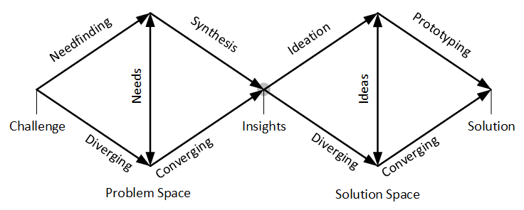 Borrowing from some aspects of Design Thinking, there is a double diamond design process model. I purloined one from the internet that will work for my purposes.