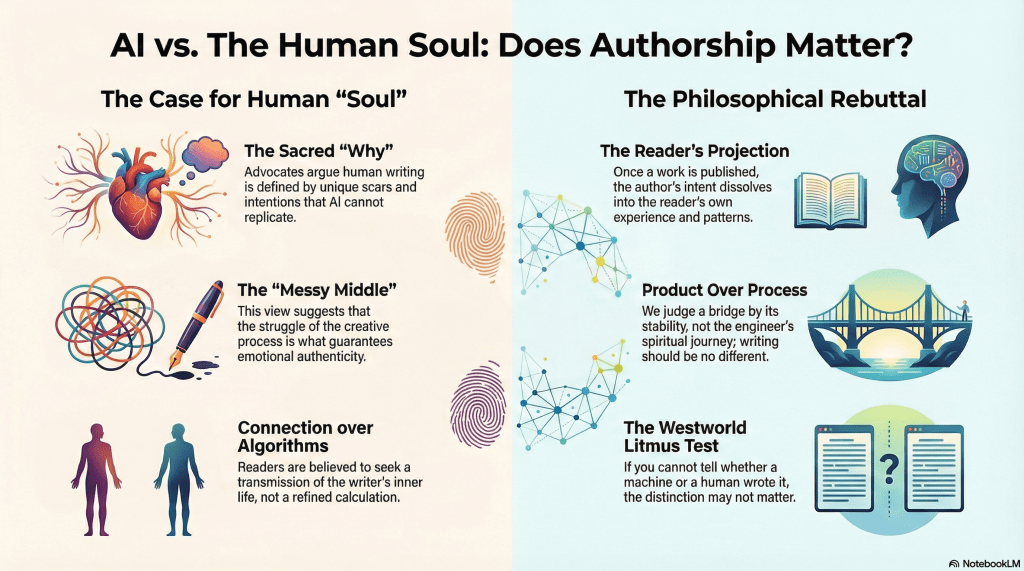 I thought of this after encountering a post that’s representative of a genre now doing brisk trade on LinkedIn and its satellites. The argument runs roughly thus: AI can write fast, but it can’t write you. Your why is sacred. Your scars make the prose real. The messy middle is where the magic lives. Keep the soul in your stories.